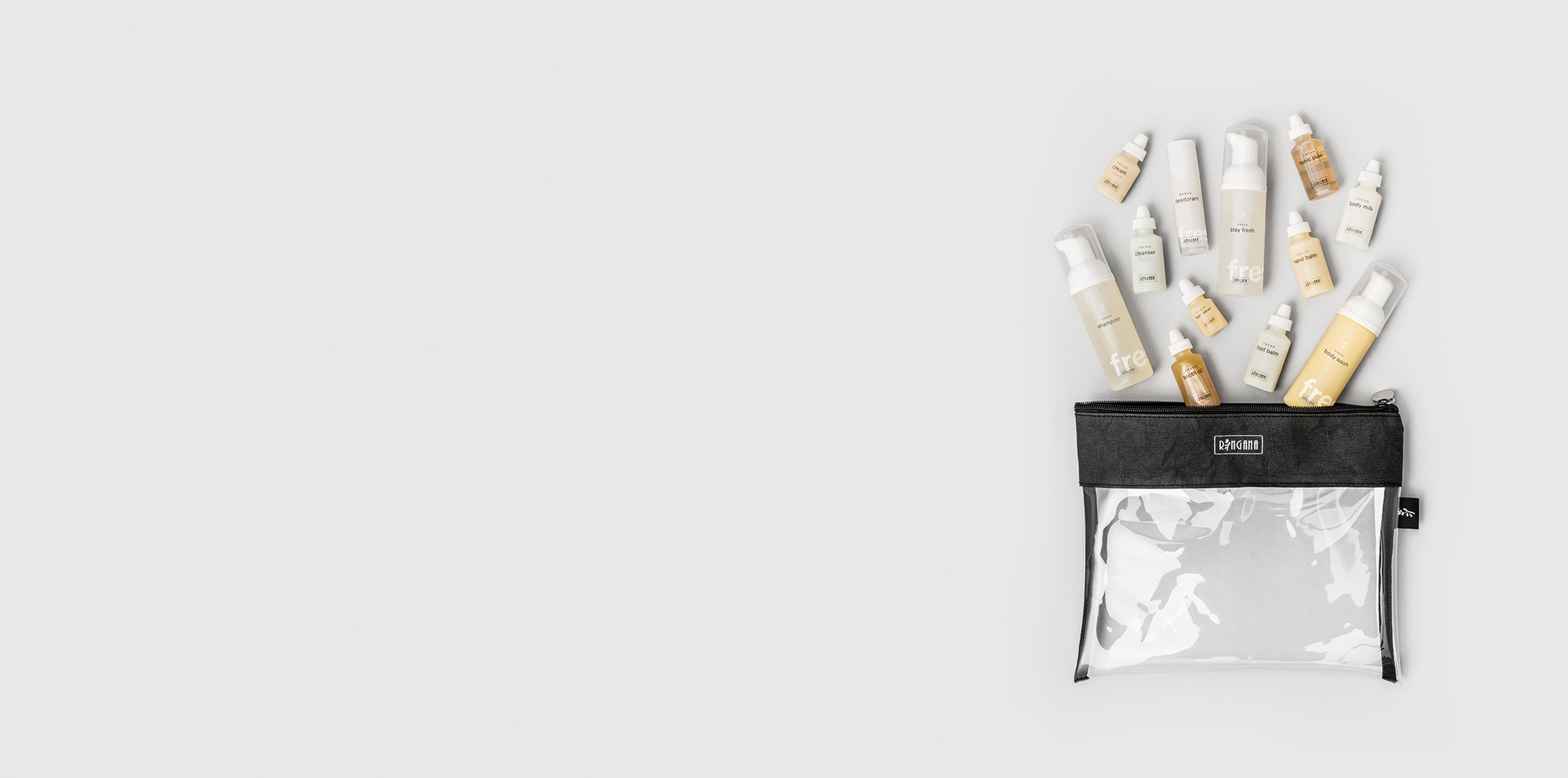 In den RINGANA travel sets sind unsere Essentials für die Gesichts-, Körper- und Waschpflege im Kleinformat vereint. Als ideale Ergänzung gibt es die transparente RINGANA travel bag, aus recyceltem PET. Damit kommen Sie problemlos durch die Handgepäckkontrolle am Flughafen.
