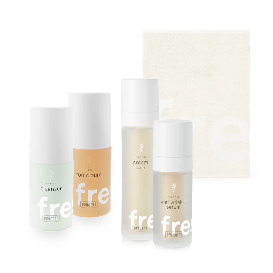 Das Gebot der Stunde in jungen Jahren lautet, vorzeitiger Hautalterung vorzubeugen. Wichtig: Die tägliche gründliche Reinigung und beim Eincremen Hals und Dekolleté nicht vergessen.Das perfekte Basis-Pflegeprogramm für tägliche Schönheit und Wohlbefinden. FRESH cleanser: Die Reinigungsmilch entfernt Schmutz und Make-up sanft und gründlich. FRESH tonic pure: Das hochwertige Tonic klärt ölige, zu Unreinheiten neigende Haut und spendet Feuchtigkeit. FRESH anti wrinkle serum: Das hoch konzentrierte Serum boostet die Haut und korrigiert und glättet Falten. FRESH cream light: Die leichte Pflege wurde speziell für zu Hautglanz und Unreinheiten neigende Haut kreiert. RINGANA schenkt Ihnen zu jedem Pflegeset das RINGANA towel medium.