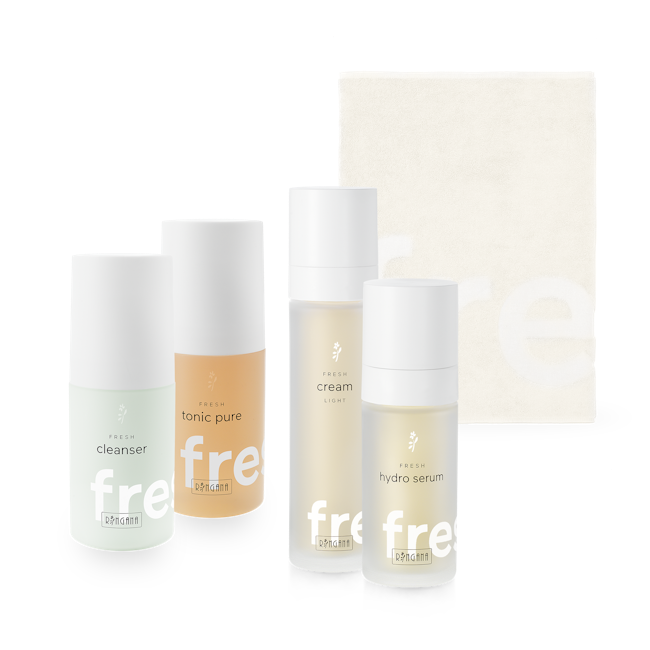 Das Gebot der Stunde in jungen Jahren lautet, vorzeitiger Hautalterung vorzubeugen. Wichtig: Die tägliche gründliche Reinigung und beim Eincremen Hals und Dekolleté nicht vergessen.Das perfekte Basis-Pflegeprogramm für tägliche Schönheit und Wohlbefinden. FRESH cleanser: Die Reinigungsmilch entfernt Schmutz und Make-up sanft und gründlich. FRESH tonic pure: Das hochwertige Tonic klärt ölige, zu Unreinheiten neigende Haut und spendet Feuchtigkeit. FRESH hydro serum: Der Durstlöscher für trockene Haut spendet ein Maximum an Feuchtigkeit. FRESH cream light: Die leichte Pflege wurde speziell für zu Hautglanz und Unreinheiten neigende Haut kreiert. RINGANA schenkt Ihnen zu jedem Pflegeset das RINGANA towel medium.