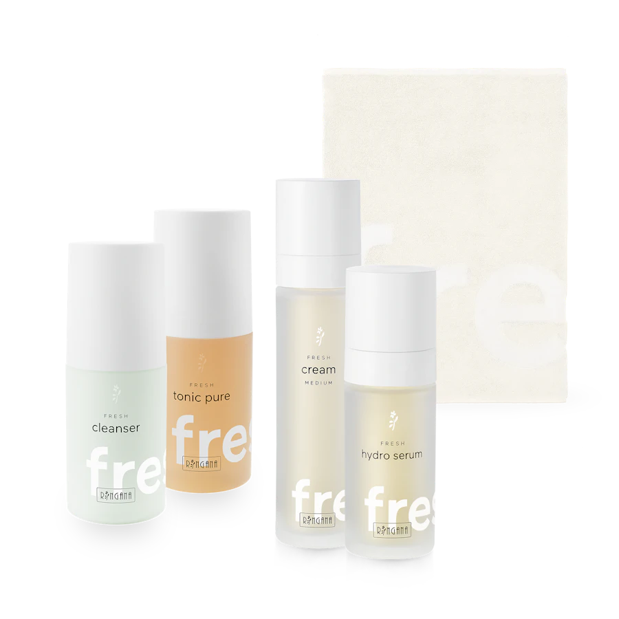 Das Gebot der Stunde in jungen Jahren lautet, vorzeitiger Hautalterung vorzubeugen. Wichtig: Die tägliche gründliche Reinigung und beim Eincremen Hals und Dekolleté nicht vergessen.Das perfekte Basis-Pflegeprogramm für tägliche Schönheit und Wohlbefinden. FRESH cleanser: Die Reinigungsmilch entfernt Schmutz und Make-up sanft und gründlich. FRESH tonic pure: Das hochwertige Tonic klärt ölige, zu Unreinheiten neigende Haut und spendet Feuchtigkeit. FRESH hydro serum: Der Durstlöscher für trockene Haut spendet ein Maximum an Feuchtigkeit. FRESH cream medium: Die smarte Formulierung stärkt die natürlichen Funktionen der Haut und macht sie widerstandsfähiger. RINGANA schenkt Ihnen zu jedem Pflegeset das RINGANA towel medium.