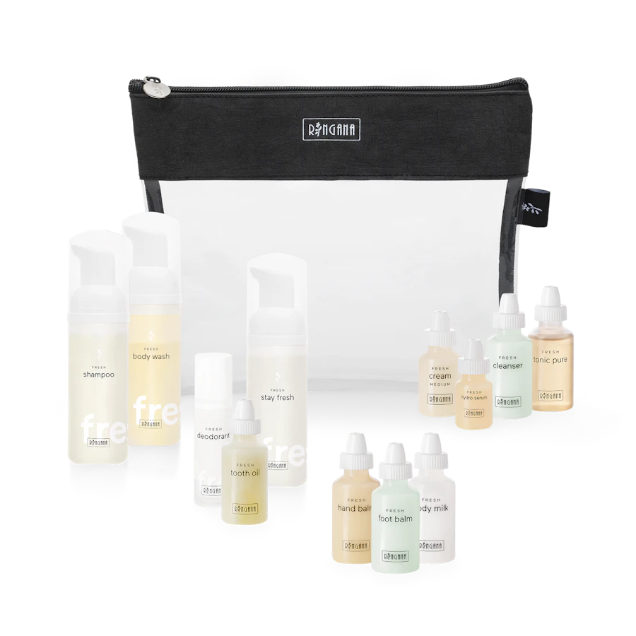 Die Pflegeminis von RINGANA sind perfekt für unterwegs. Zur Auswahl stehen die Reisesets wash, body und face. Und wer sich für alle drei entscheidet, bekommt von RINGANA ein tolles Geschenk: Ein praktisches durchsichtiges Etui, das auf jeder Flugreise mit ins Handgepäck darf. Im Sinne der Nachhaltigkeit wurde das Etui aus recycelten PET-Flaschen hergestellt.In unserem FRESH travel set medium sind gleich drei Sample Boxes vereint. Für die Gesichtspflege gibt es die FRESH sample box face medium, für die Körperpflege die FRESH sample box body und für die Waschpflege die FRESH sample box wash. Für den bequemen Transport gibt es als Draufgabe die transparente RINGANA travel bag – in der Größe 20 x 25 cm – als Geschenk.