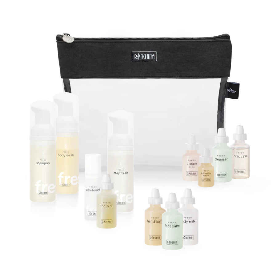 Die Pflegeminis von RINGANA sind perfekt für unterwegs. Zur Auswahl stehen die Reisesets wash, body und face. Und wer sich für alle drei entscheidet, bekommt von RINGANA ein tolles Geschenk: Ein praktisches durchsichtiges Etui, das auf jeder Flugreise mit ins Handgepäck darf. Im Sinne der Nachhaltigkeit wurde das Etui aus recycelten PET-Flaschen hergestellt.In unserem FRESH travel set rich sind gleich drei Sample Boxes vereint. Für die Gesichtspflege gibt es die FRESH sample box face rich, für die Körperpflege die FRESH sample box body und für die Waschpflege die FRESH sample box wash. Für den bequemen Transport gibt es als Draufgabe die transparente RINGANA travel bag – in der Größe 20 x 25 cm – als Geschenk.